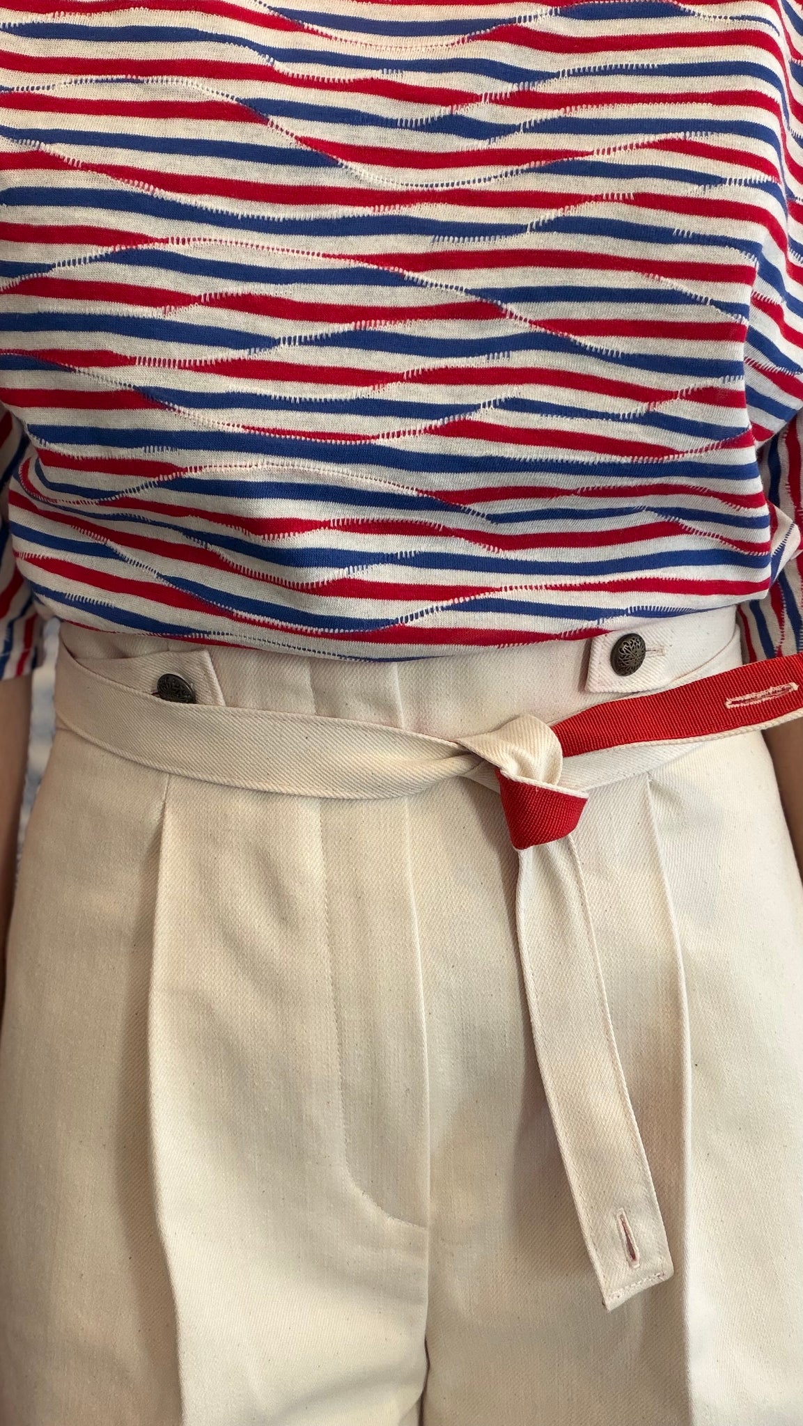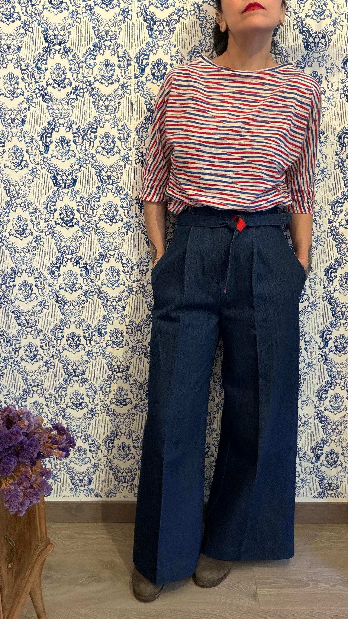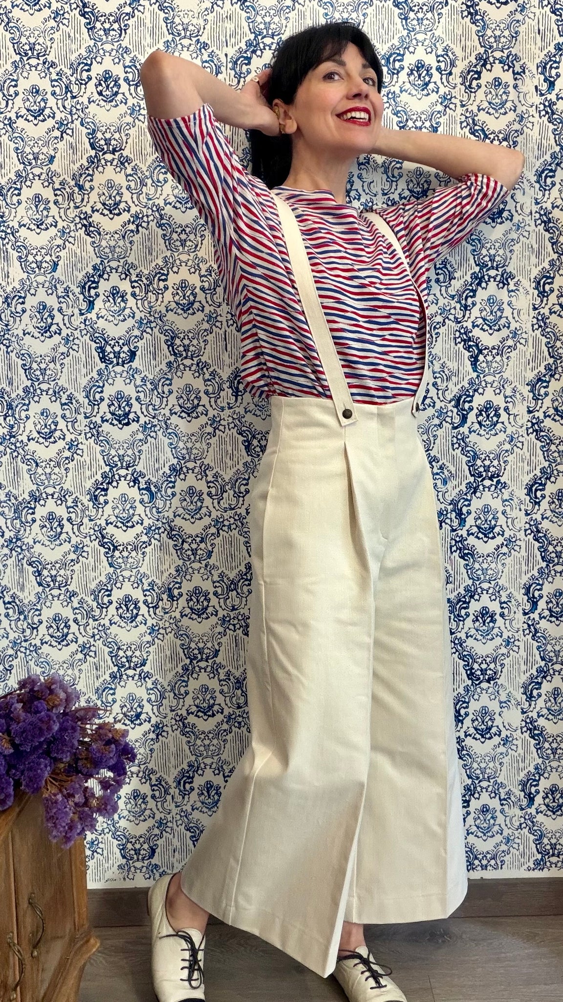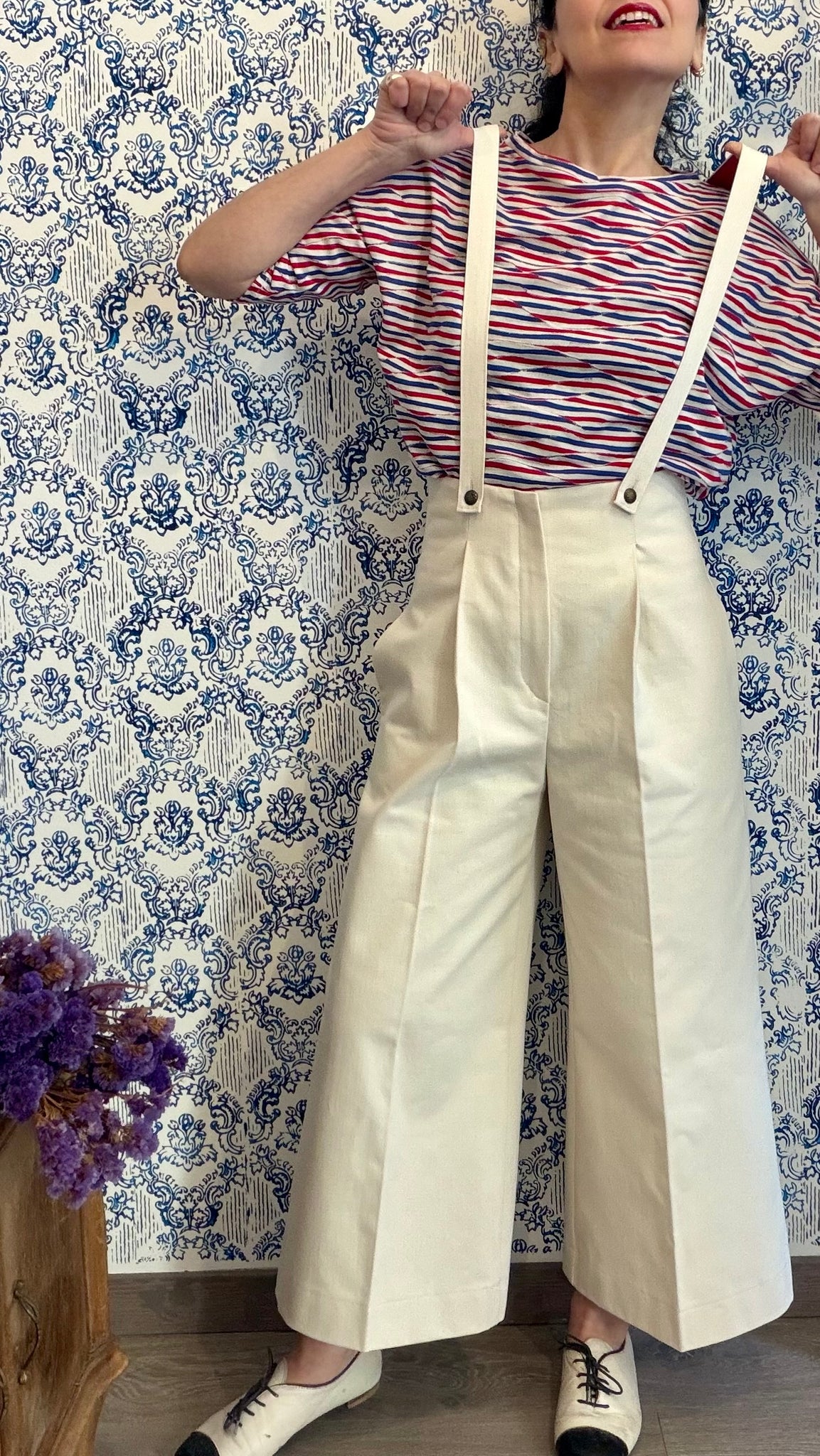 Il pantabretelle ha vita alta, leggermente ad imbuto per armonizzare la totalità della figura, una gamba molto larga e comoda, proprio come il famoso pantalone Chanel. Le tasche sono laterali in cucitura. Le pinces sono 2 nella versione con gamba corta, altrimenti 1 pince per la versione con gamba lunga.