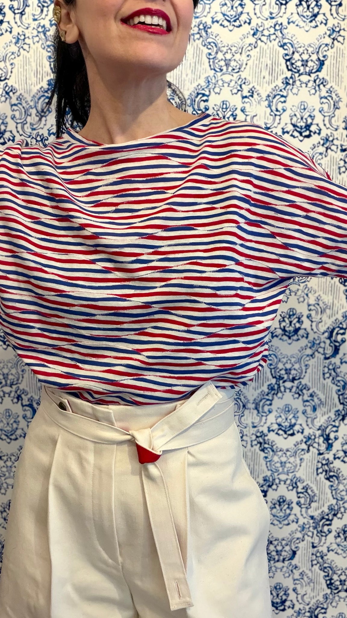 La divisa della primavera: un jeans diverso e divertente con una maglietta che non può che essere a righe per la bella stagione.