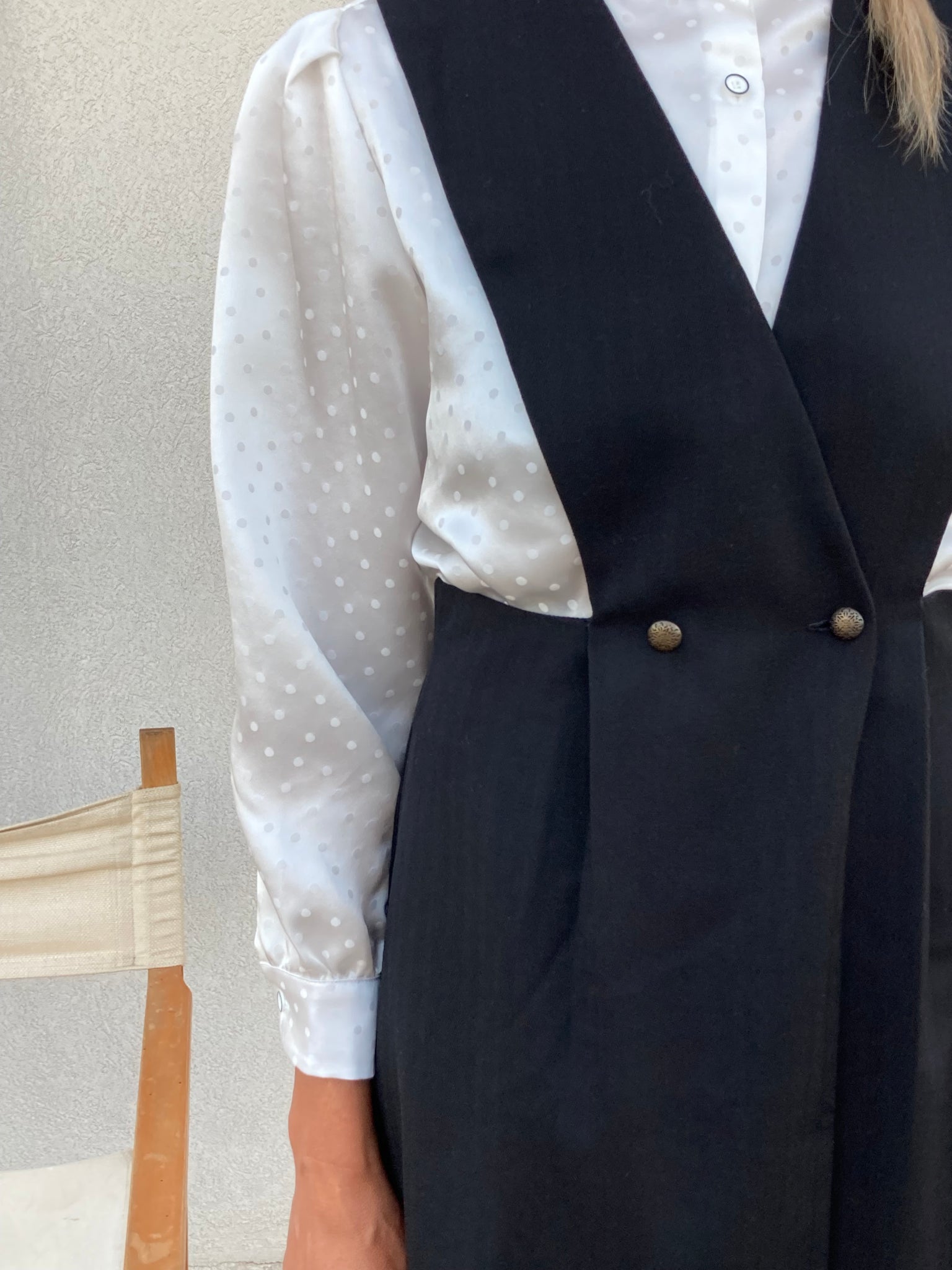 Nasce dall’idea di un grembiule e come tale deve essere semplicissimo da mettere, abbottonato in questa versione a doppio petto da 4 bottoni oppure da 2 e una spilla per tenerlo più chiuso.