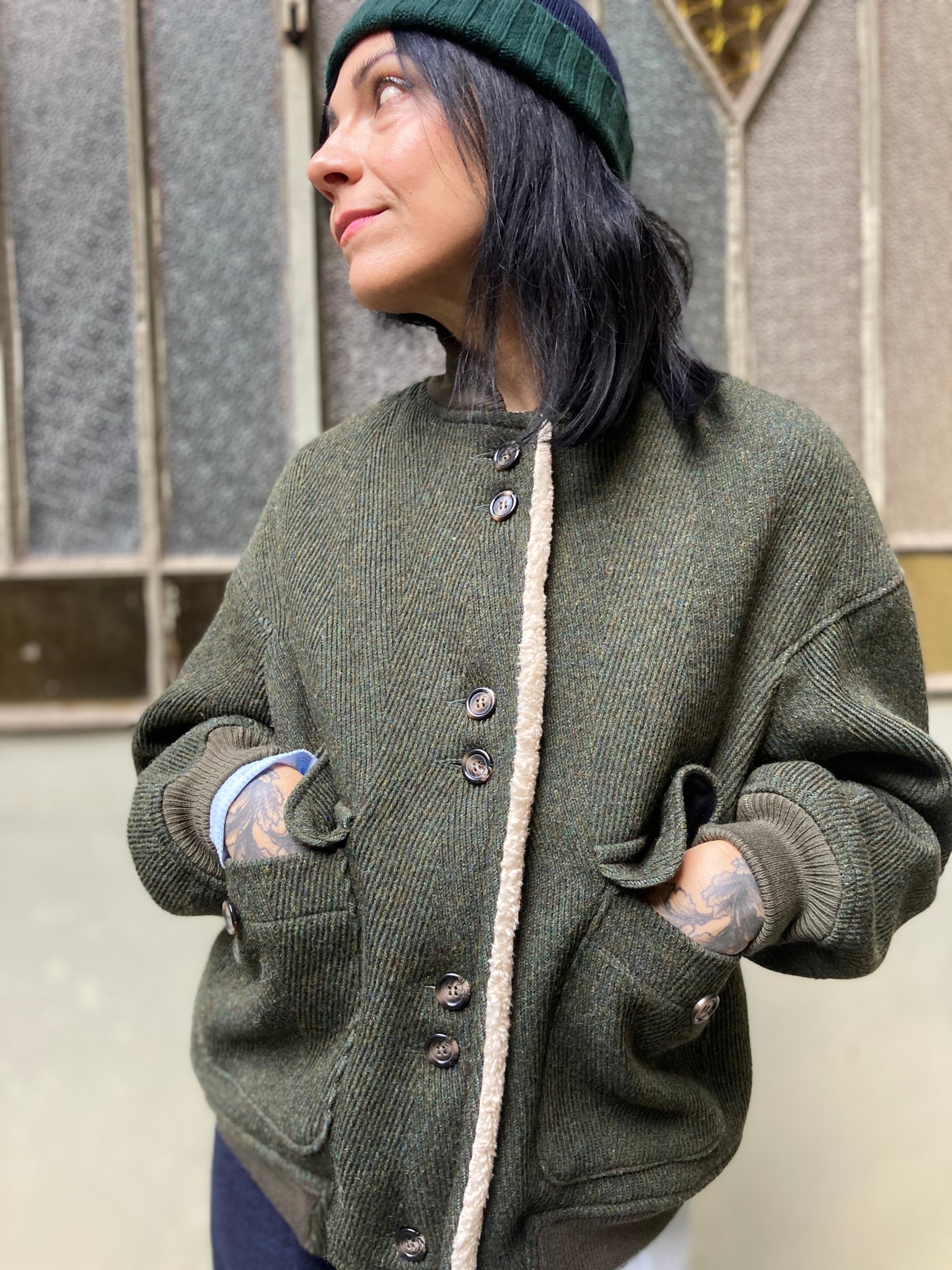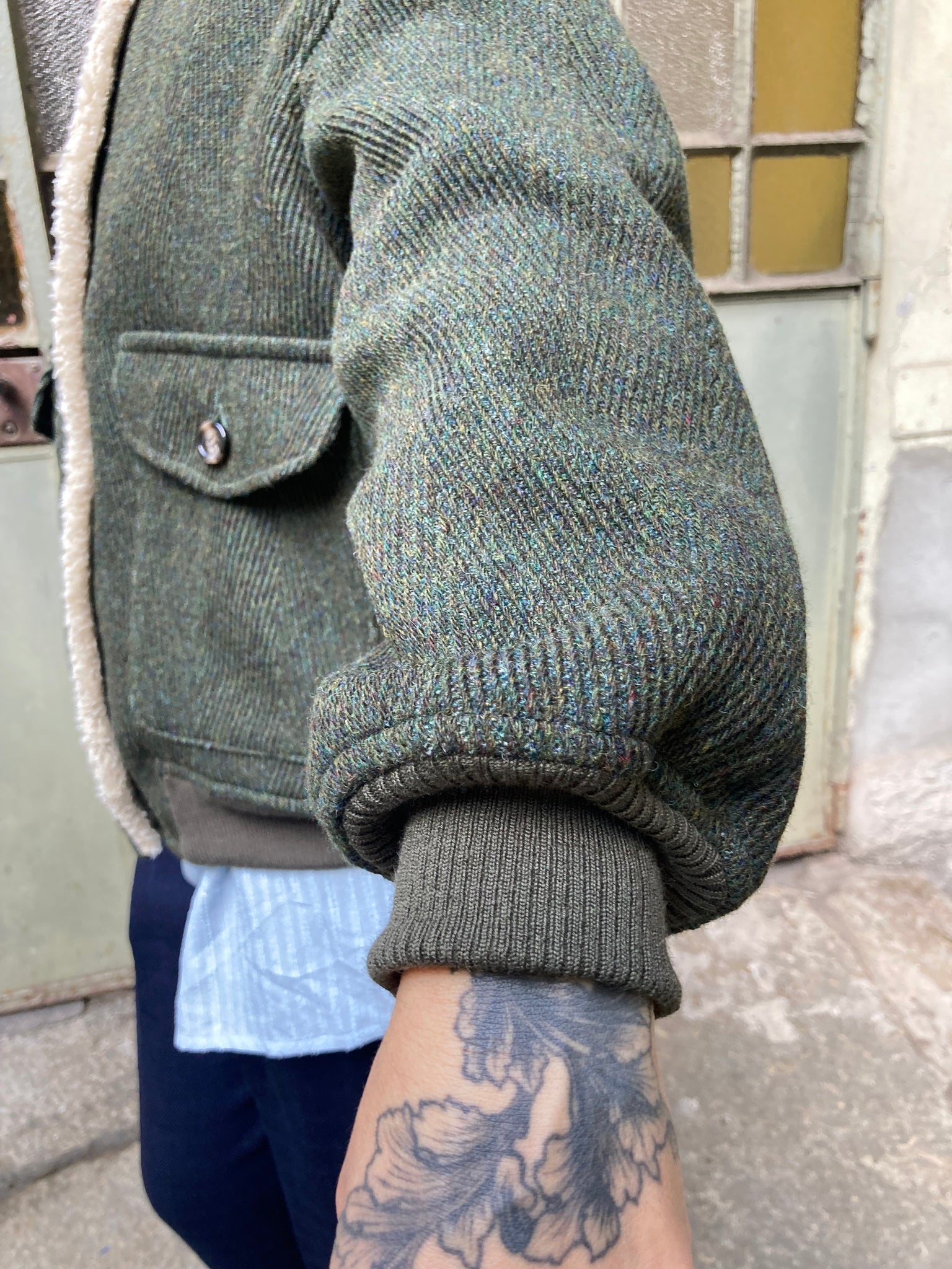 Ha volumi ampi, lunghezza al fianco e i dettagli di maglia nei bordi fondo, polsi e colletto. L’ ho voluto molto caldo e per questo è doppiato nella classica pelliccetta ecologica, che sborda di 1 cm sulla chiusura per dargli movimento e rimandare ad un altro classico, la giacca jeans Levi’s foderata in questo modo. Le maniche sono foderate normalmente perché così si scivola meglio dentro.