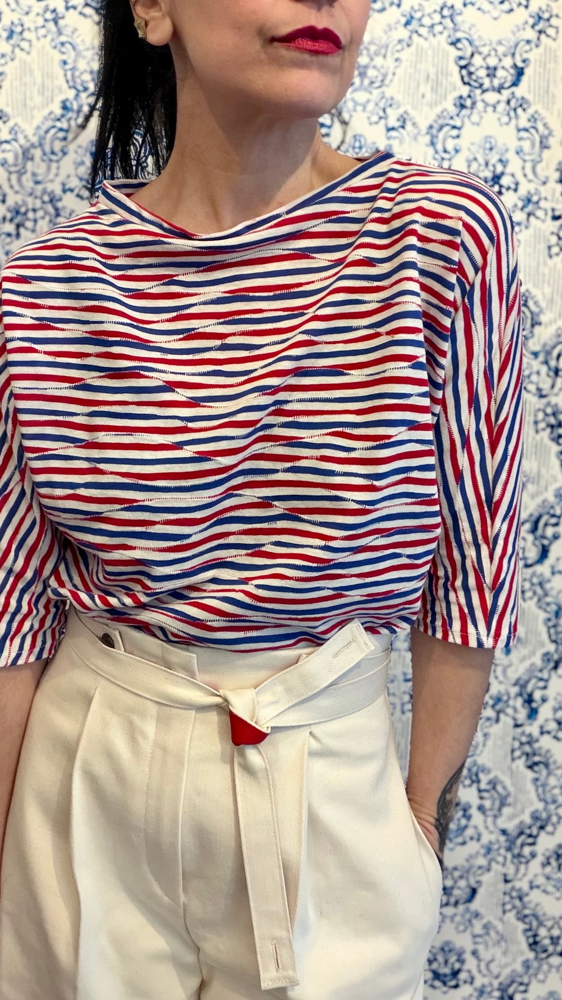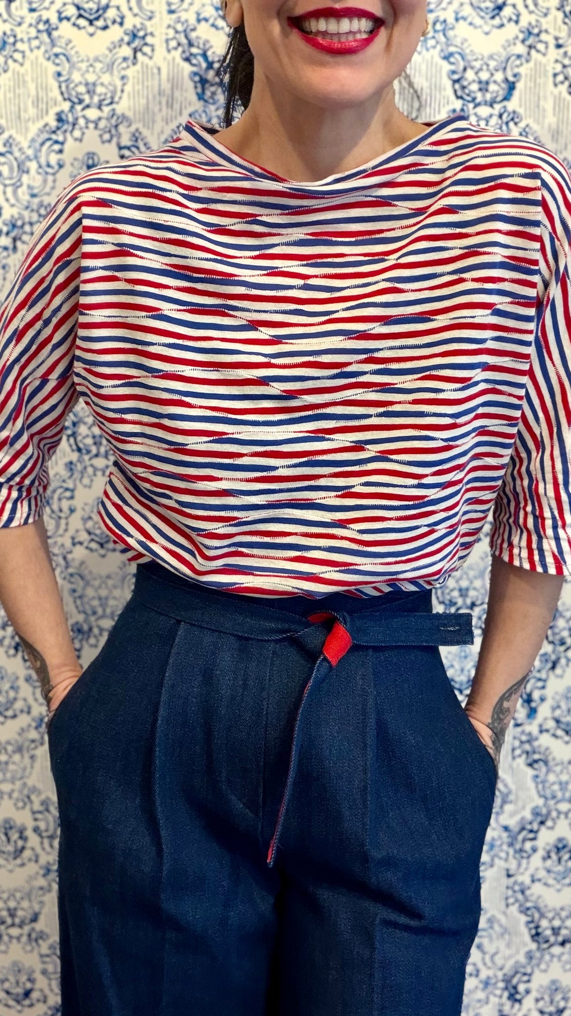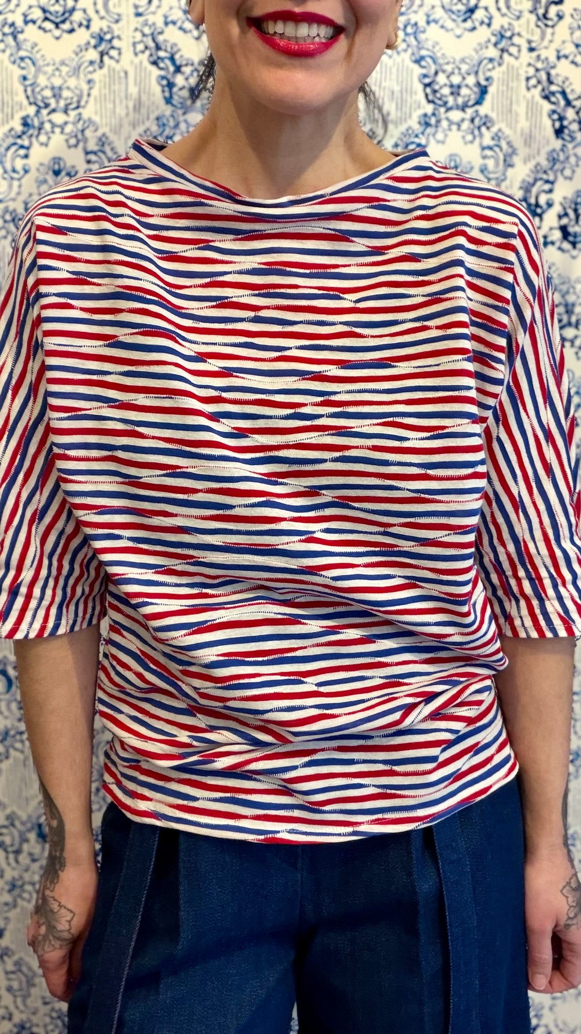 La marinière di quest’anno è in 100% jersey di cotone fresco e morbidissimo, con scollo a barchetta, manica kimono per adattarsi ad ogni tipo di spalla e lunghezza 3/4 per essere ancora più femminile, in 3 colori classici per una mariniere.