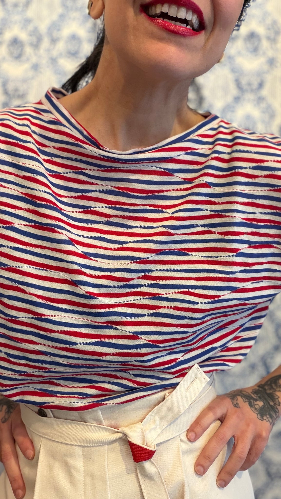 Questa t-shirt ha da sempre ha un’ allure francese, naïf e sofisticata nella sua semplicità.