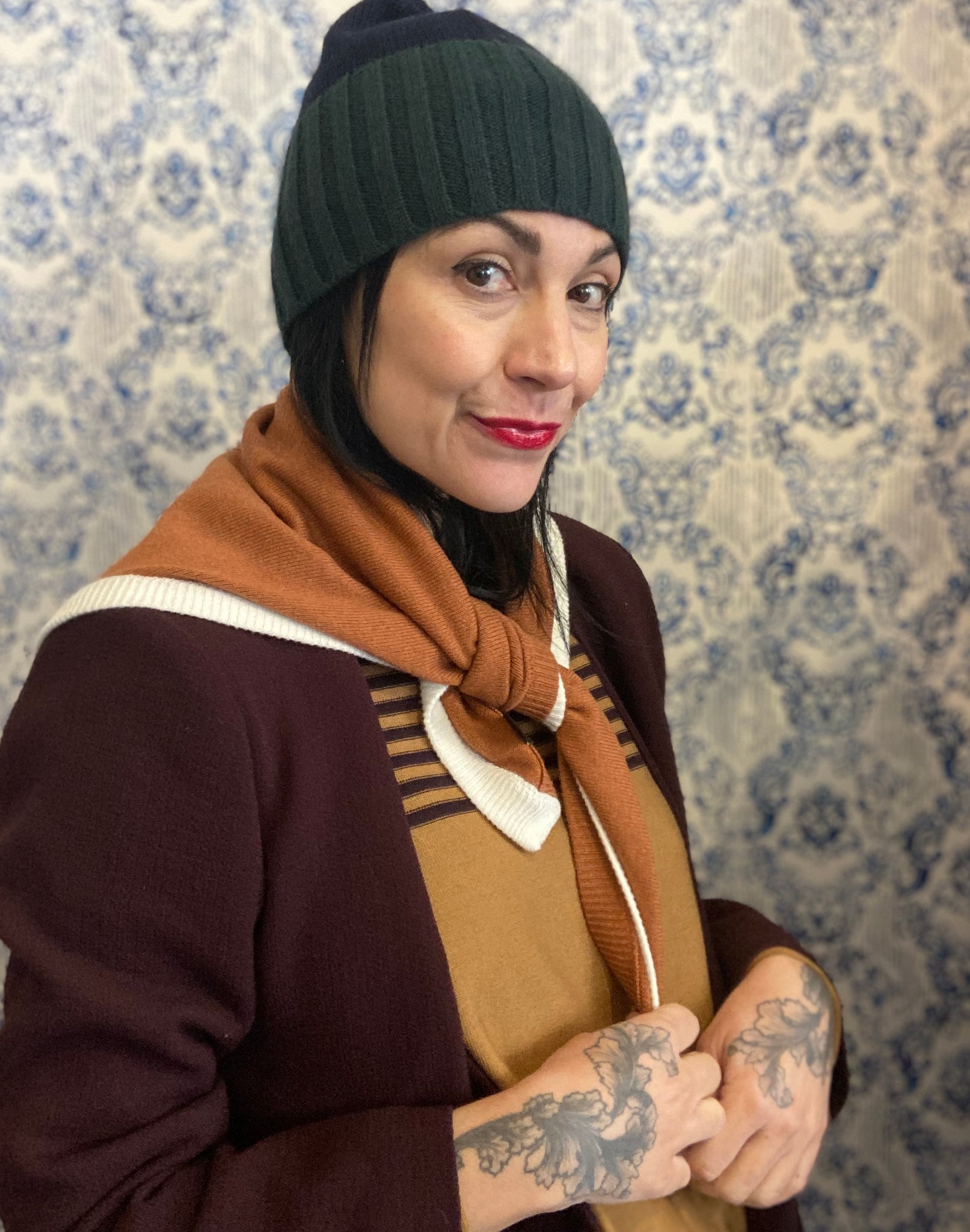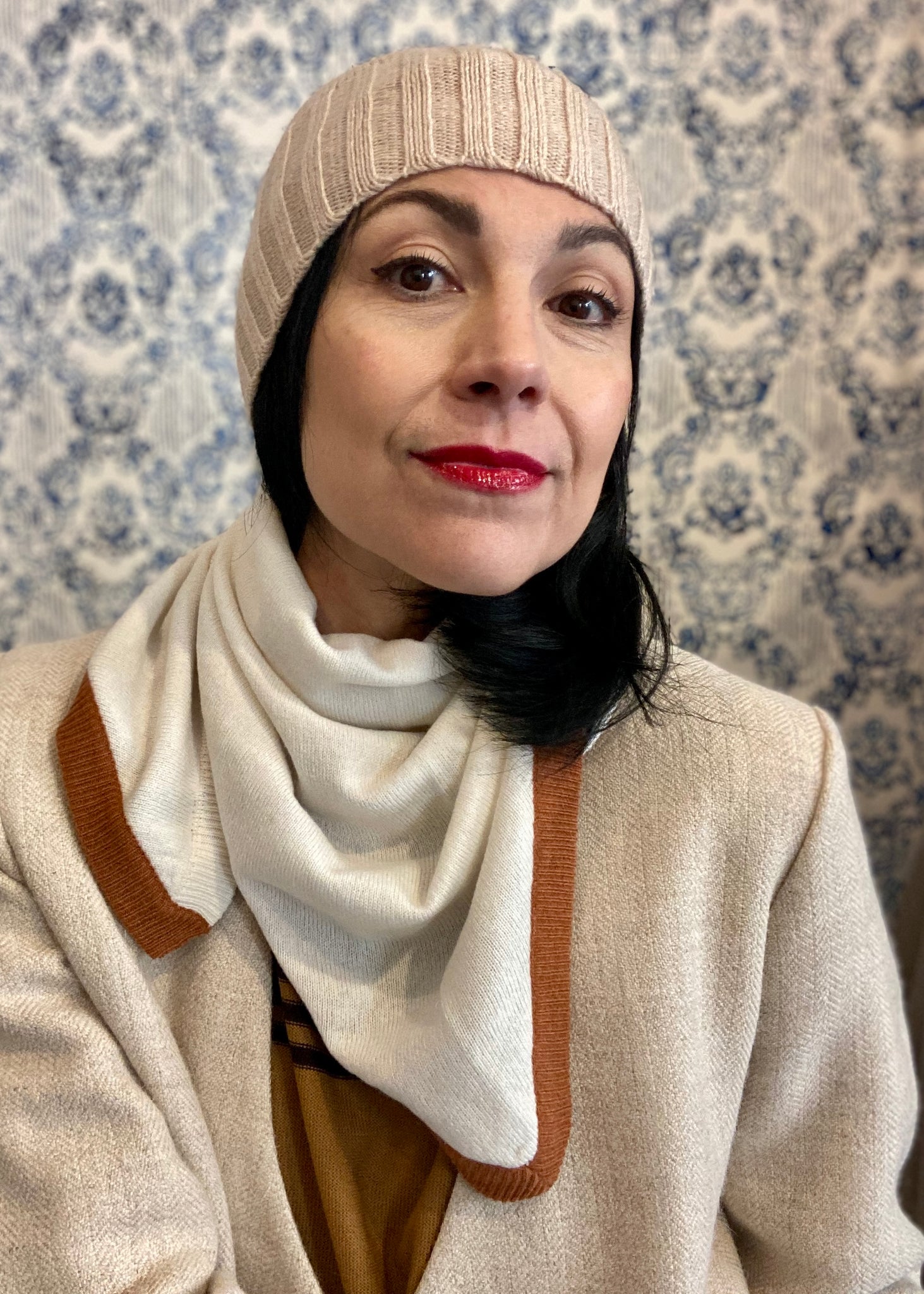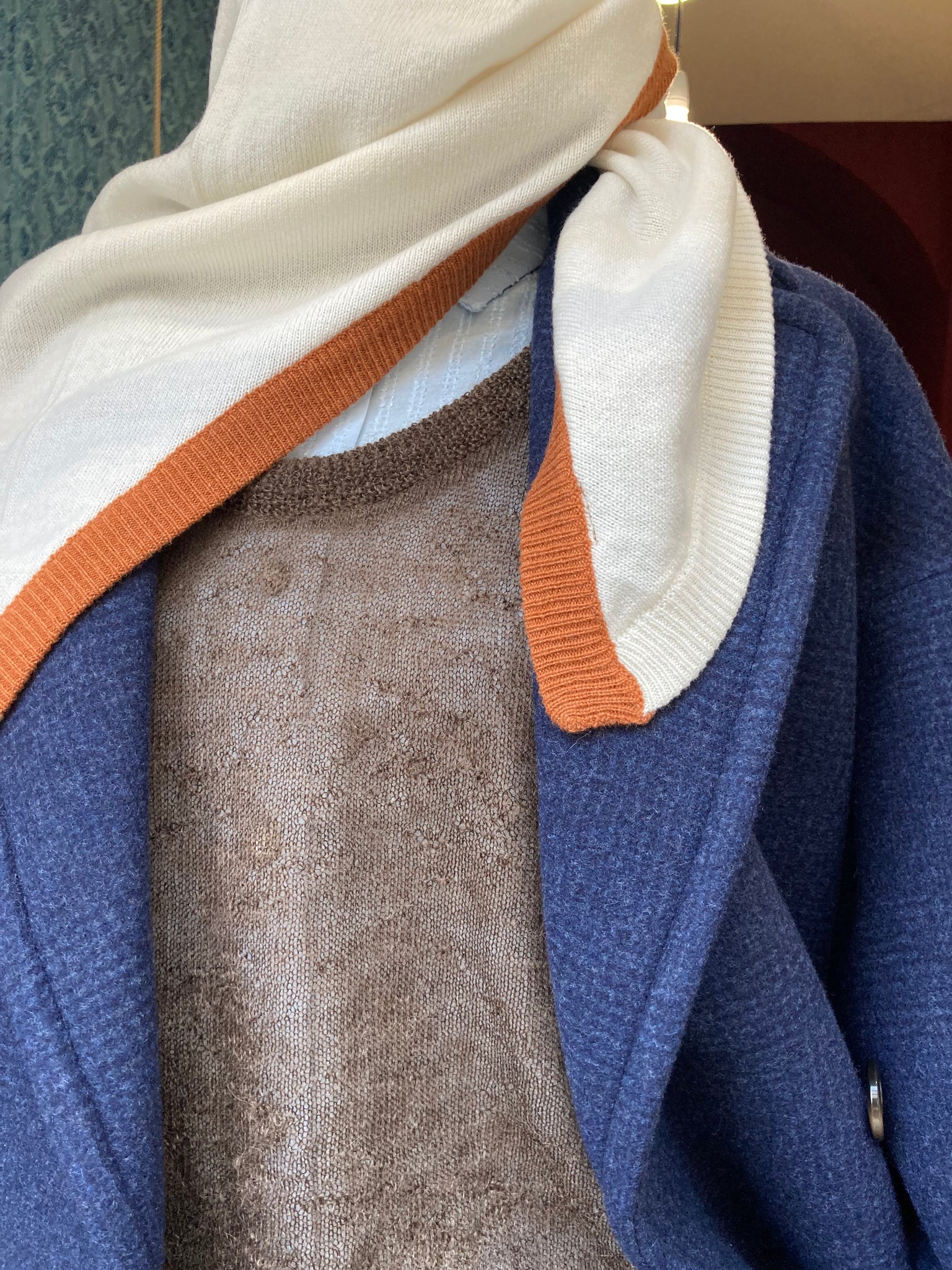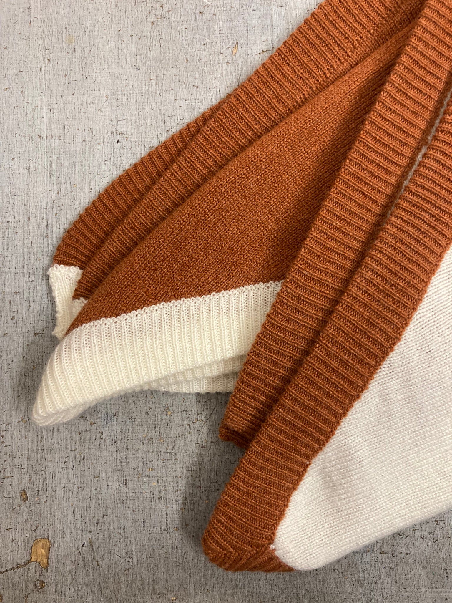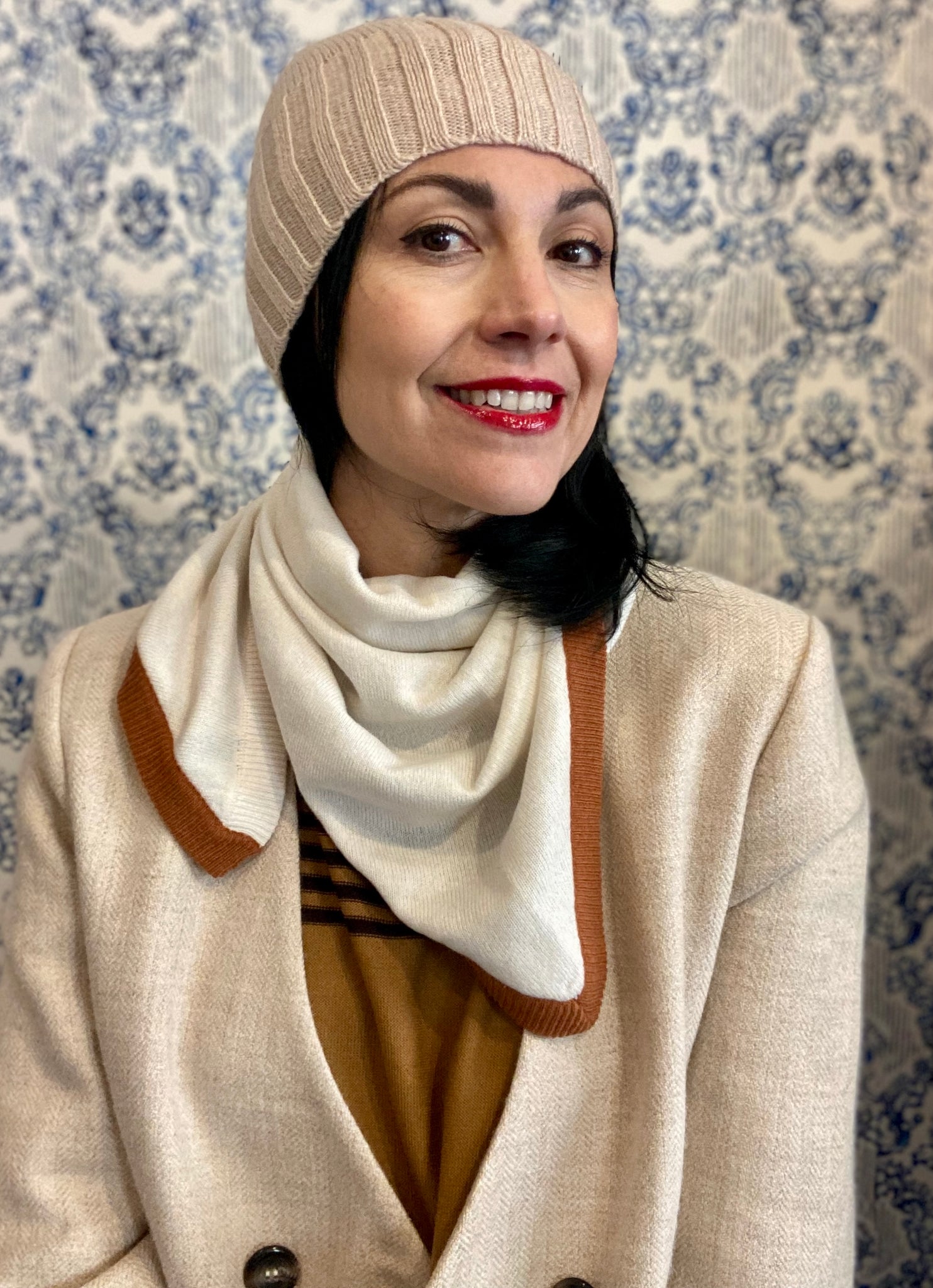 Nella versione in cachemire i colori sono morbidi e caldi, un latte e cannella mescolati.