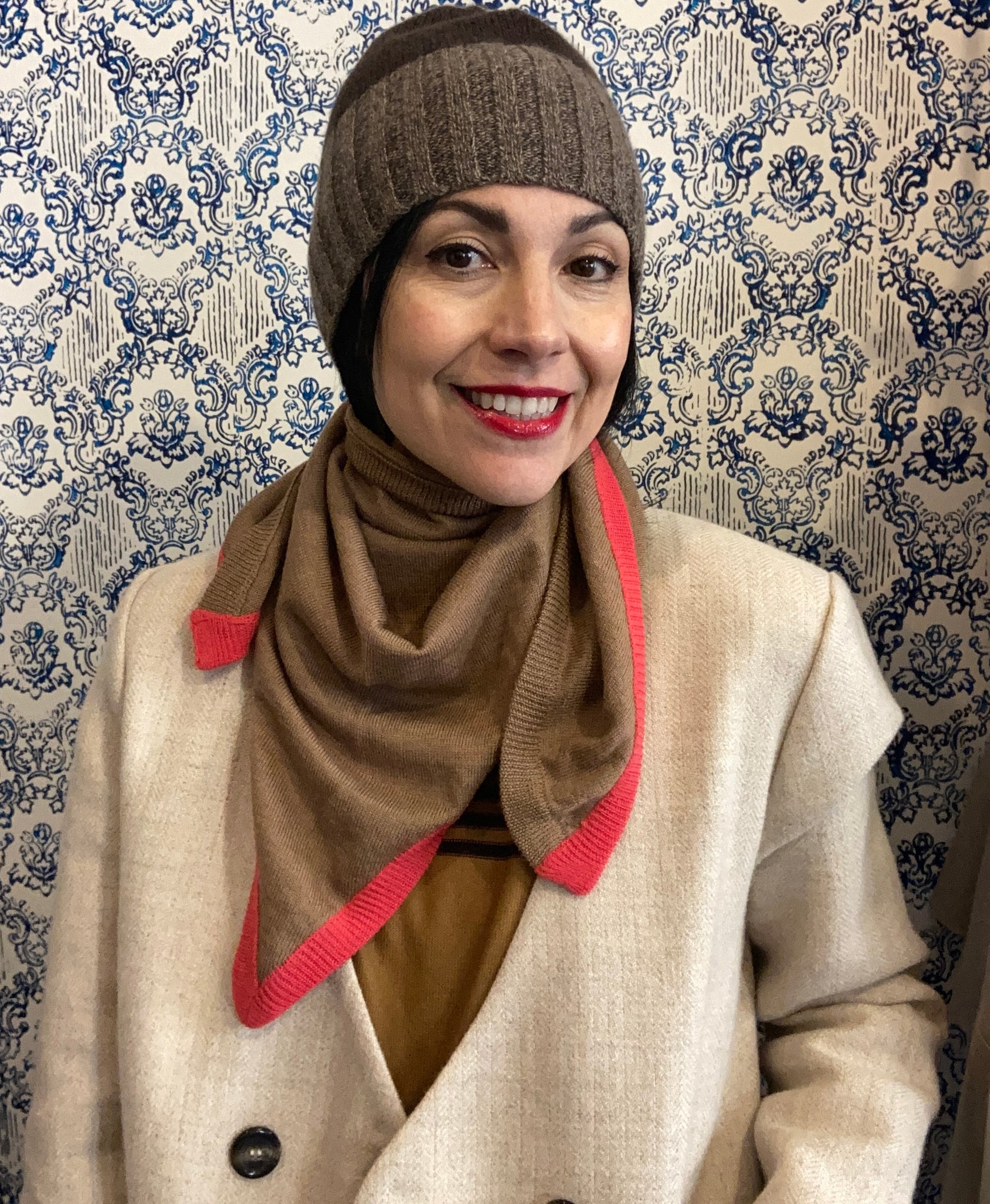 Comodità ed eleganza insieme per una sciarpa che ha la forma di un foulard ripiegato a triangolo.