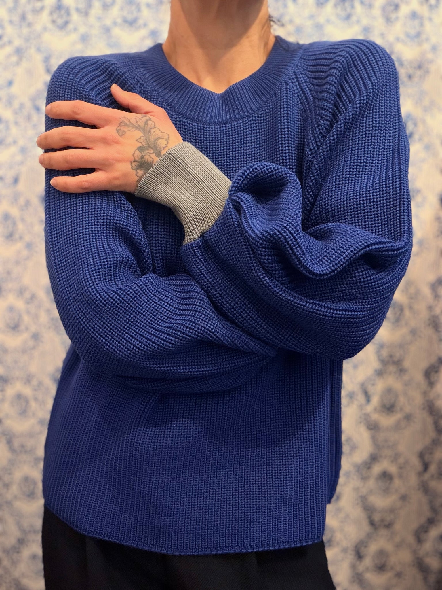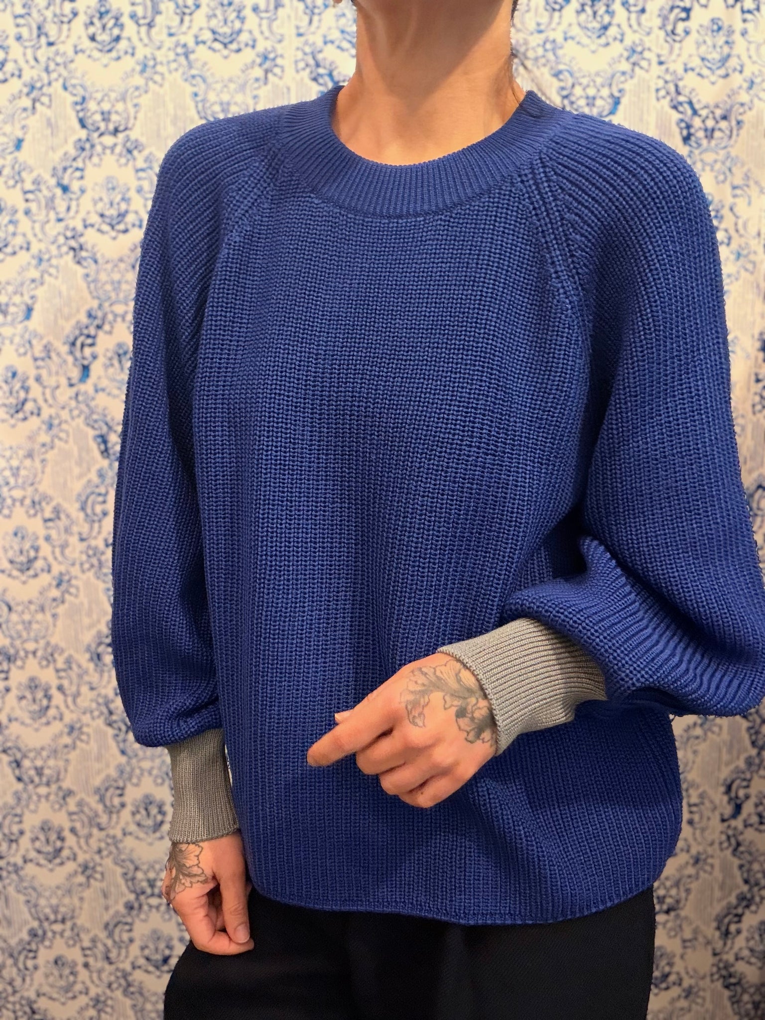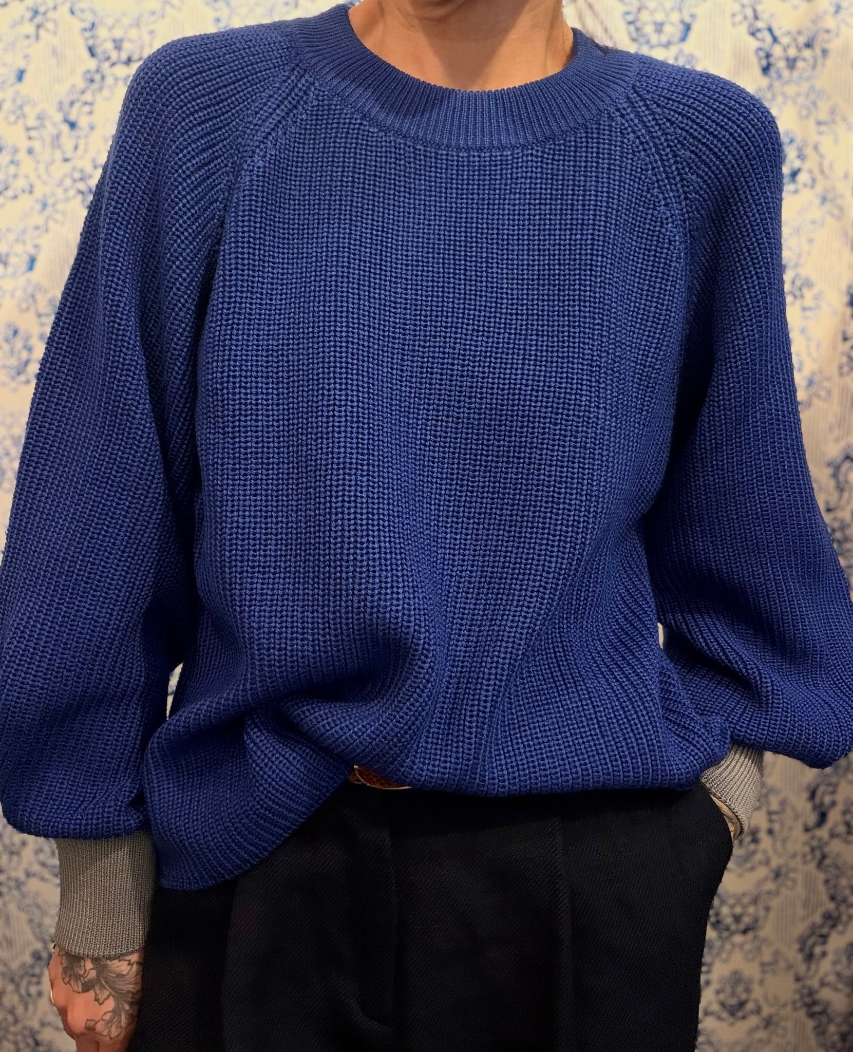 E’ un modello senza tempo, con una lavorazione a coste che si chiama punto perlato. Lungo 10cm sotto la vita, è molto comodo perché ha un’ampiezza over, data anche dalla manica raglan abbondante, che accoglie grandezze diverse di spalle, e finisce con una pince a sbuffo. Il polsino ha sempre un colore a contrasto.