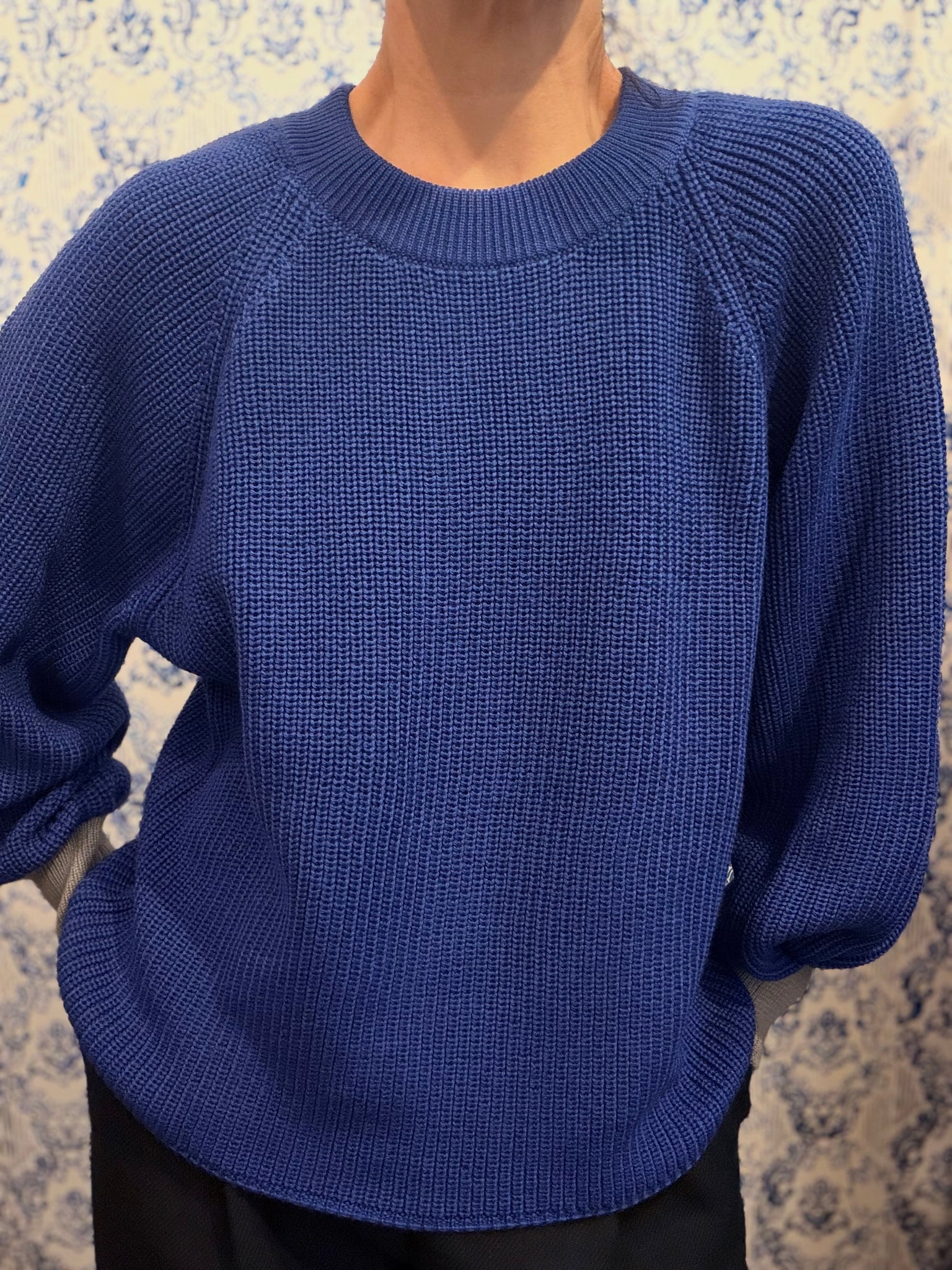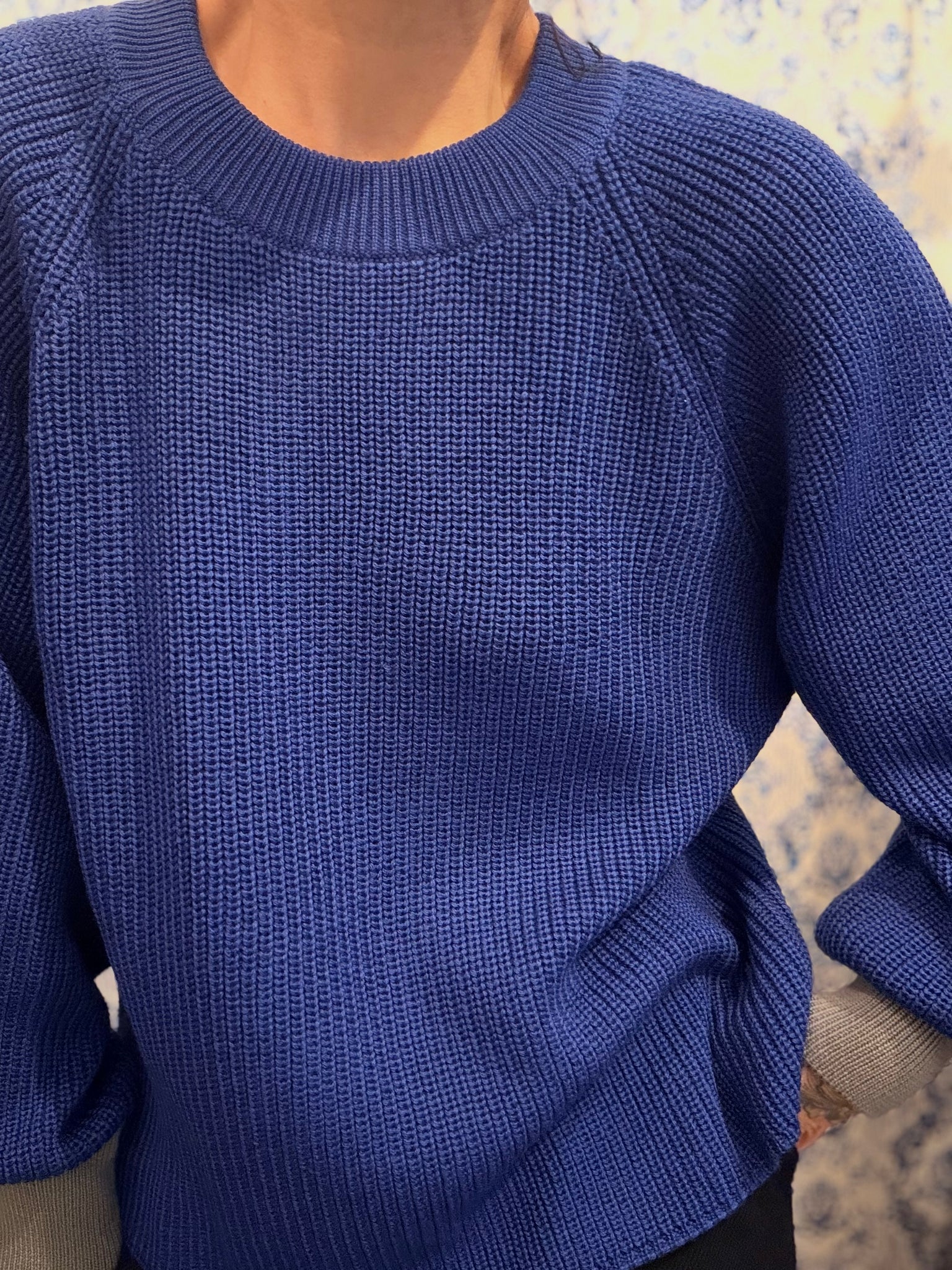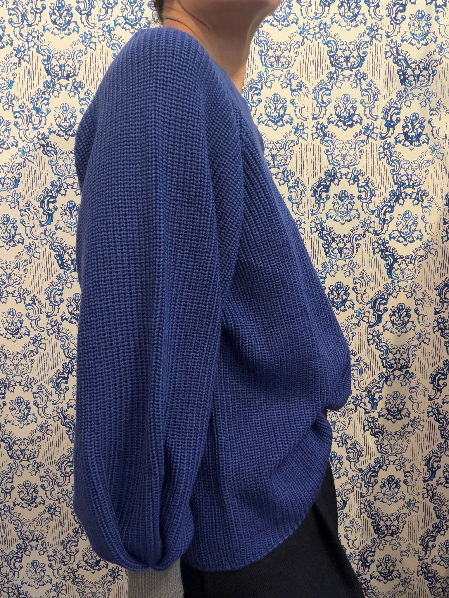 E’ un modello senza tempo, con una lavorazione a coste che si chiama punto perlato. Lungo 10cm sotto la vita, è molto comodo perché ha un’ampiezza over, data anche dalla manica raglan abbondante, che accoglie grandezze diverse di spalle, e finisce con una pince a sbuffo. Il polsino ha sempre un colore a contrasto.